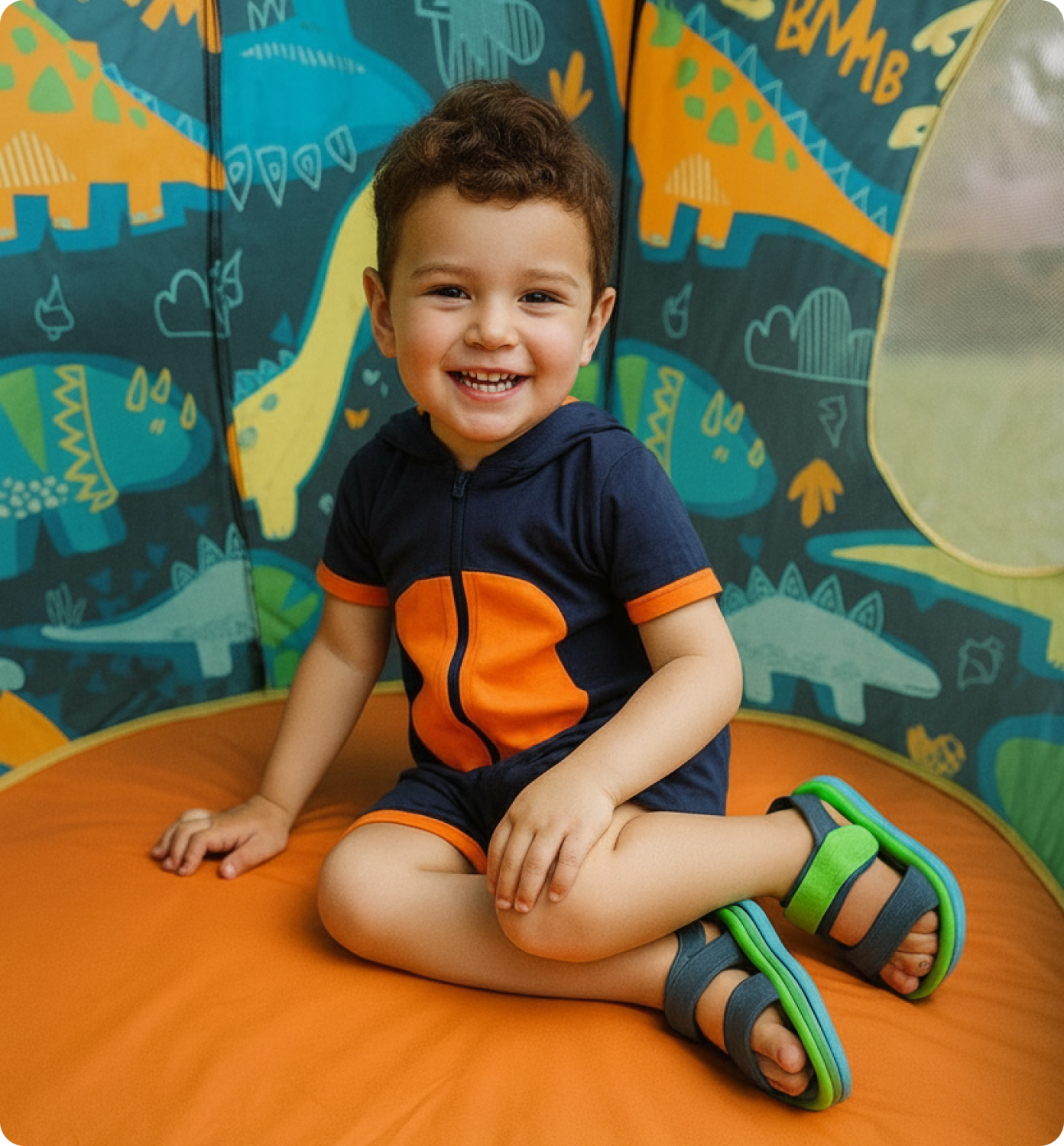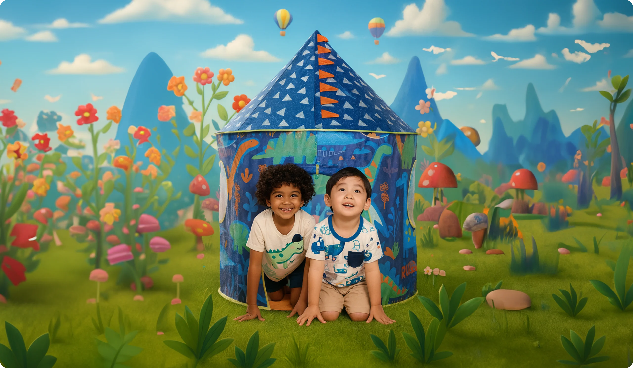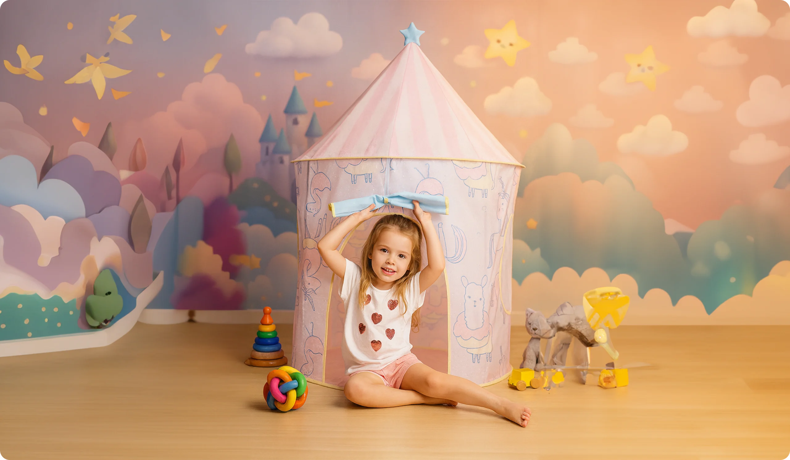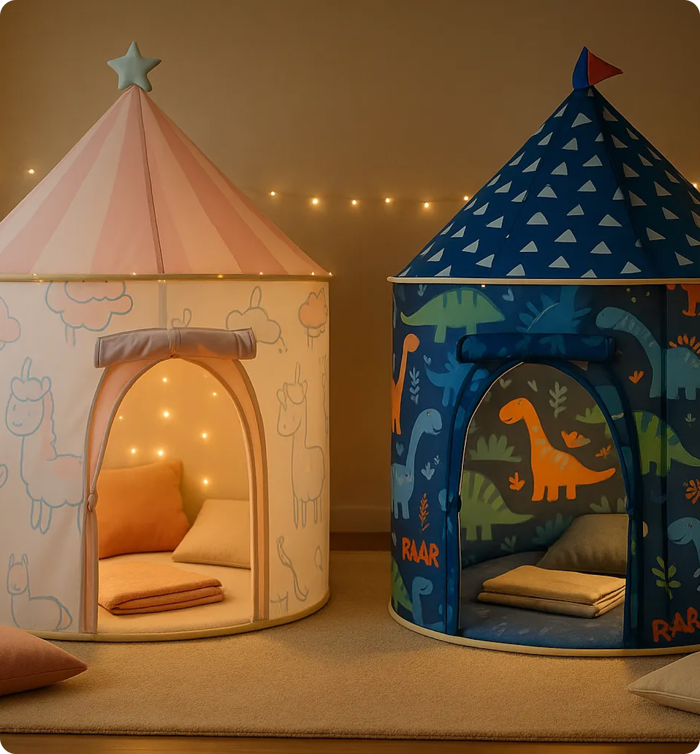 A Mood desenvolveu uma tenda infantil que funciona como uma cabaninha lúdica, criando um refúgio de brincadeira para a criança. Os temas Dino e Unicórnio foram escolhidos estrategicamente para dialogar com as estampas bestsellers das coleções de roupas da marca.